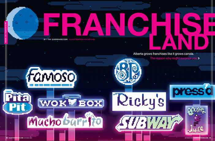 Illustration for Alberta Venture on the numerous franchises popping up in Alberta. I may or may not have eaten at 3-4 of these places while doing the project. Damn you advertising.